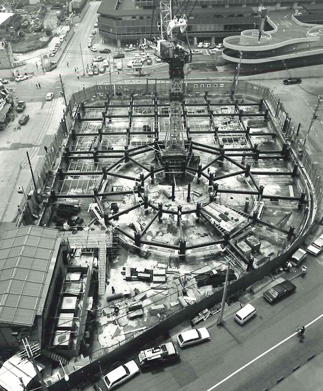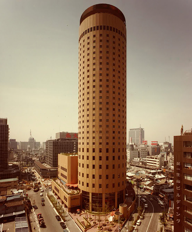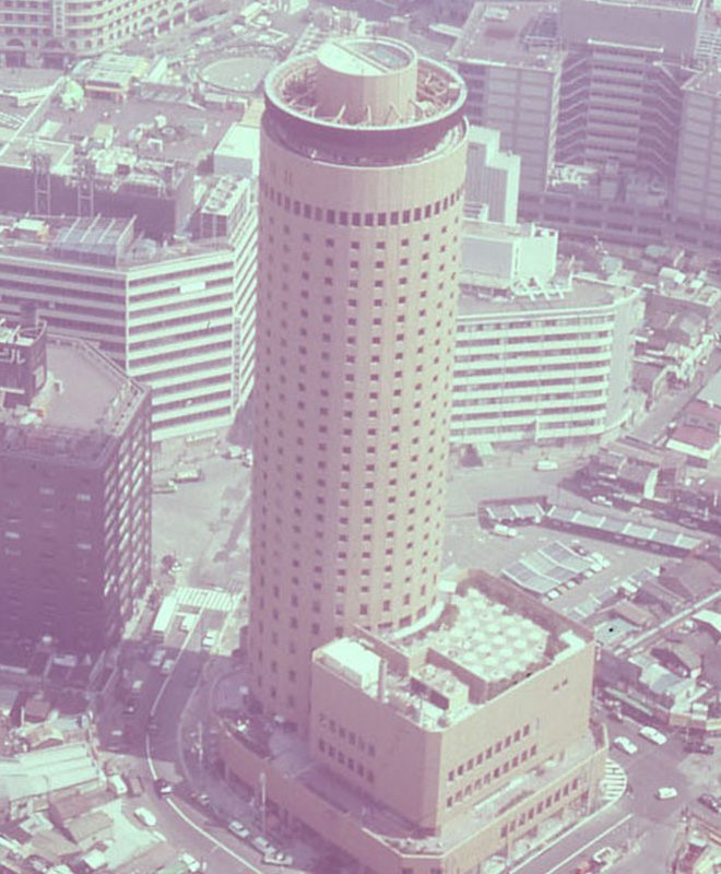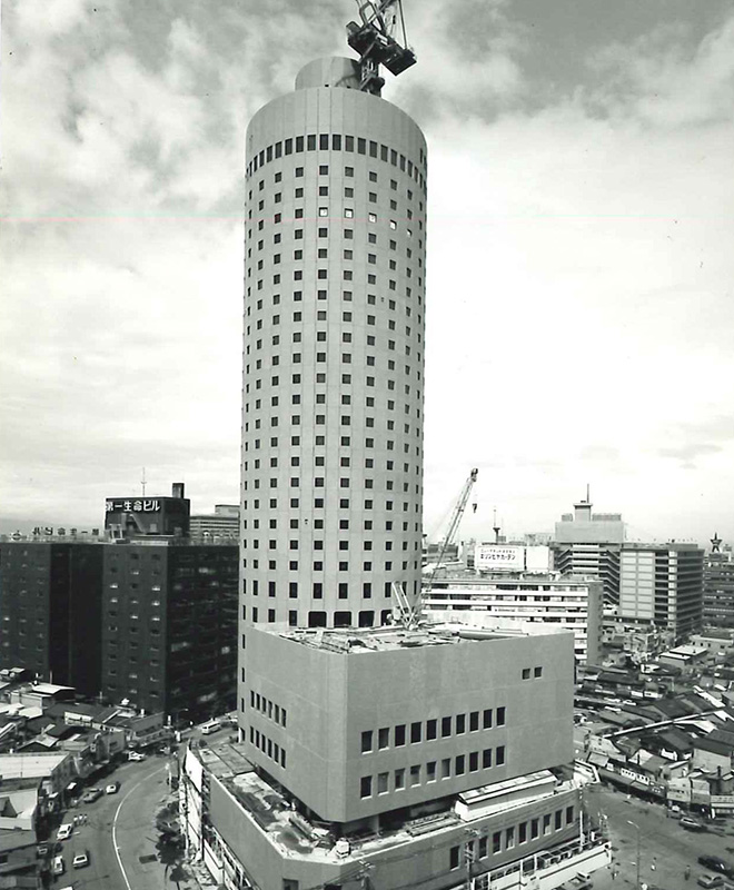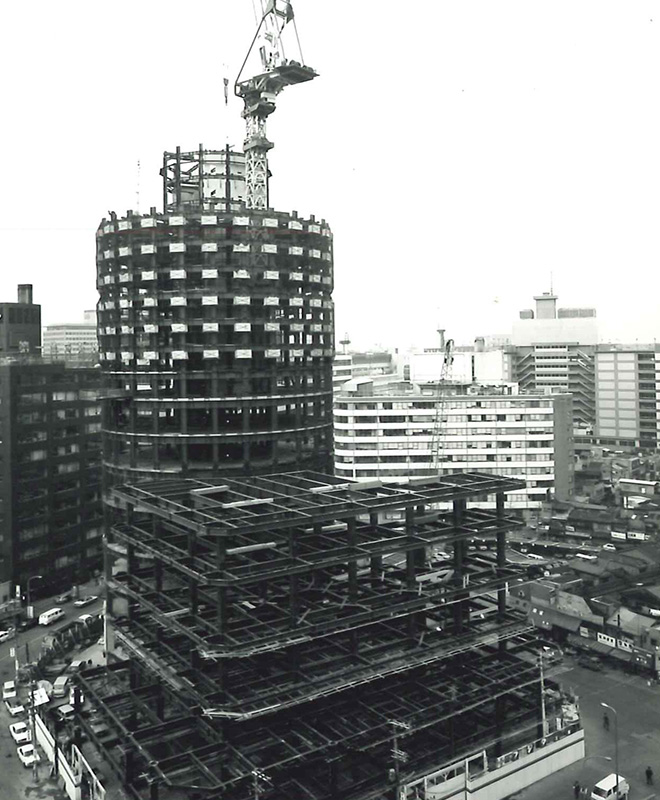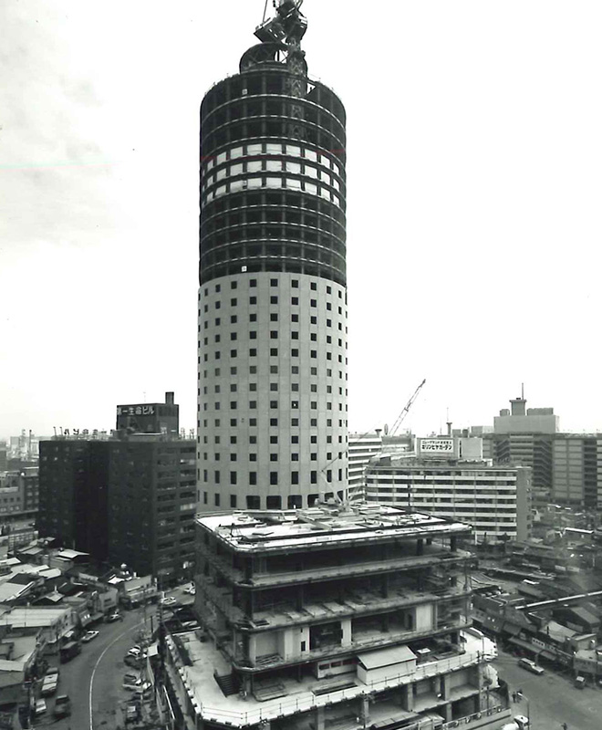 日本初の円筒形超高層ビルとして当時の最新鋭技術を結集して施工